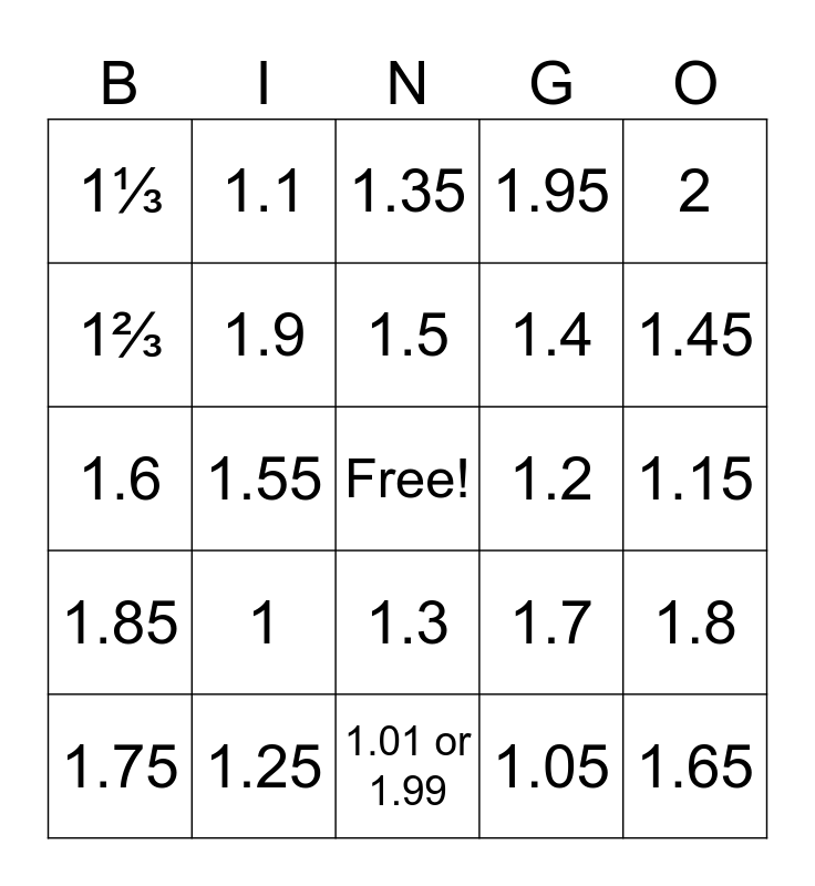This bingo card has a free space and 24 words: 1, 1.25, 1.5, 1.75, 2, 1⅓, 1⅔, 1.1, 1.2, 1.3, 1.4, 1.6, 1.7, 1.8, 1.9, 1.05, 1.15, 1.35, 1.45, 1.55, 1.65, 1.85, 1.95 and 1.01 or 1.99.