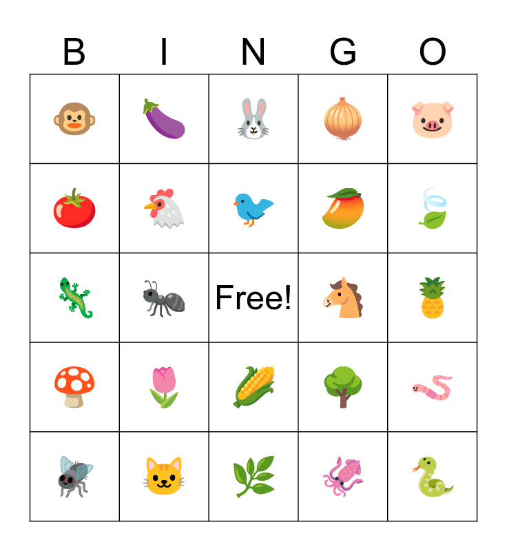 This bingo card has a free space and 29 words: 🐶, 🐱, 🐰, 🐮, 🐷, 🐵, 🐔, 🐦, 🐴, 🪱, 🪰, 🐜, 🦑, 🐍, 🦎, 🐟, 🌿, 🌳, 🍃, 🍄, 🌷, 🍌, 🥭, 🍍, 🍅, 🍆, 🌽, 🧅 and 🥔.