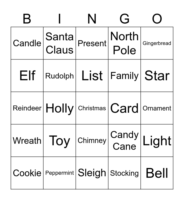 This bingo card has a free space and 24 words: Toy, Peppermint, List, Cookie, Gingerbread, Candle, Elf, Santa Claus, Card, Chimney, Family, Reindeer, Candy Cane, Light, Rudolph, Stocking, Ornament, Present, Star, Holly, Bell, Wreath, North Pole and Sleigh.
