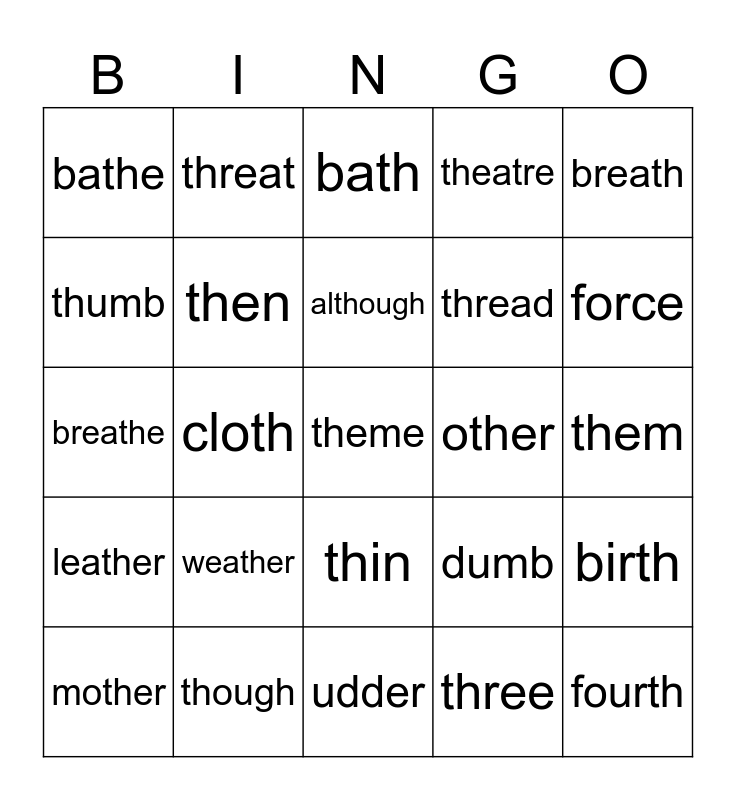 This bingo card has 30 words: though, clothes, cloth, cloths, bathe, bath, then, thin, other, udder, them, theme, three, fourth, force, that, dumb, leather, weather, breath, breathe, thing, threat, thread, thumb, theatre, birth, mother, although and this.