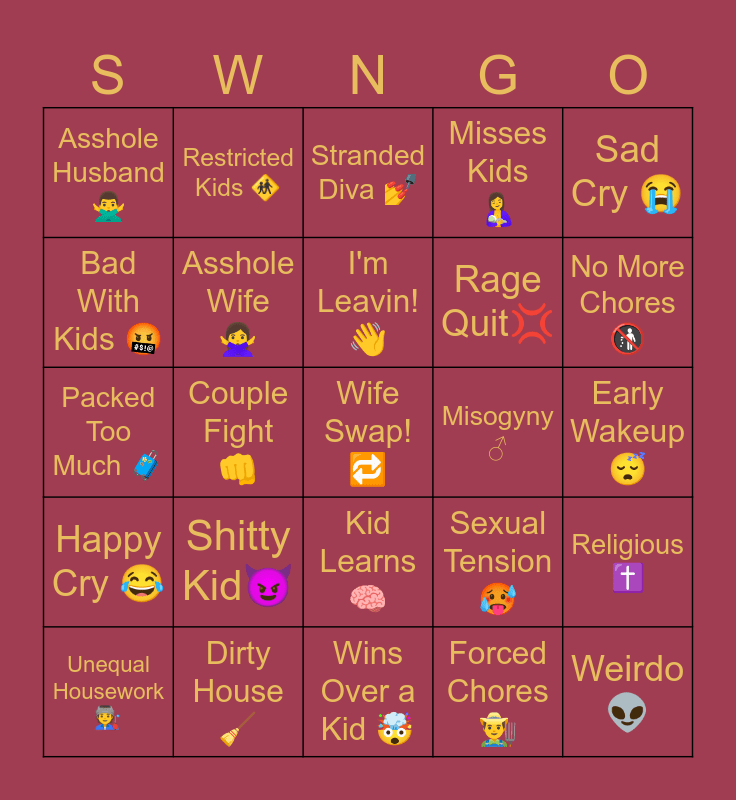 This bingo card has a free space and 28 words: Religious โ๏ธ, Lessons Learned๐ก, Rage Quit๐ข, Forced Chores ๐จโ๐พ, Bad With Kids ๐คฌ, Stranded Diva ๐ , Restricted Kids ๐ธ, Happy Cry ๐, Misogyny โ๏ธ, Unequal Housework ๐งโ๐ญ, Packed Too Much ๐งณ, Misses Kids ๐คฑ, Dirty House ๐งน, Wins Over a Kid ๐คฏ, No More Chores ๐ฏ, Militant ๐ซ, Shitty Kid๐, Asshole Wife ๐ โโ๏ธ, I'm Leavin! ๐, Kid Learns ๐ง , Asshole Husband ๐ โโ๏ธ, Opposite Families ๐๐, Weirdo ๐ฝ, Couple Fight ๐, Early Wakeup ๐ด, Sexual Tension ๐ฅต, Sad Cry ๐ญ and Call CPS! ๐ฎโโ๏ธ.