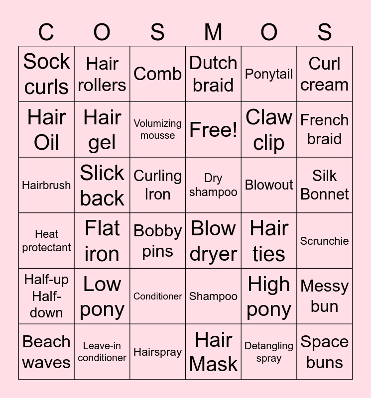 This bingo card has 36 words: Shampoo, Conditioner, Hair Mask, Hair Oil, Heat protectant, Dry shampoo, Hair gel, Hairspray, Ponytail, High pony, French braid, Dutch braid, Messy bun, Slick back, Free!, Sock curls, Half-up Half-down, Blowout, Hairbrush, Comb, Curling Iron, Flat iron, Blow dryer, Bobby pins, Hair ties, Hair rollers, Claw clip, Leave-in conditioner, Volumizing mousse, Curl cream, Space buns, Beach waves, Scrunchie, Silk Bonnet, Low pony and Detangling spray.
