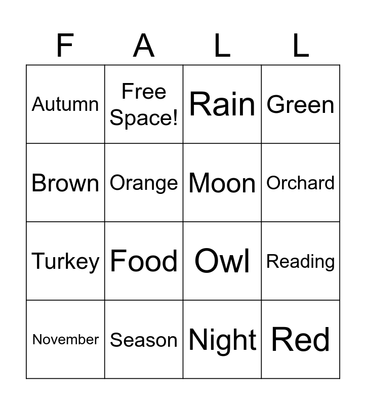 This bingo card has 24 words: Pumpkin, Leaf, Orchard, Harvest, Brown, Autumn, Orange, Free Space!, Season, Sunflower, Turkey, Owl, Thanksgiving, Fire, Moon, Football, Night, Rain, Food, Reading, November, Red, Green and Wind.