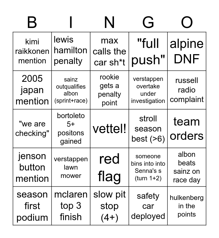 This bingo card has a free space and 24 words: verstappen lawn mower, mclaren top 3 finish, rookie gets a penalty point, season first podium, alpine DNF, kimi raikkonen mention, 2005 japan mention, lewis hamilton penalty, stroll season best (>6), red flag, verstappen overtake under investigation, "we are checking", someone bins into into Senna's s (turn 1+2), albon beats sainz on race day, sainz outqualifies albon (sprint+race), safety car deployed, team orders, max calls the car sh*t, russell radio complaint, bortoleto 5+ positons gained, hulkenberg in the points, jenson button mention, "full push" and slow pit stop (4+).