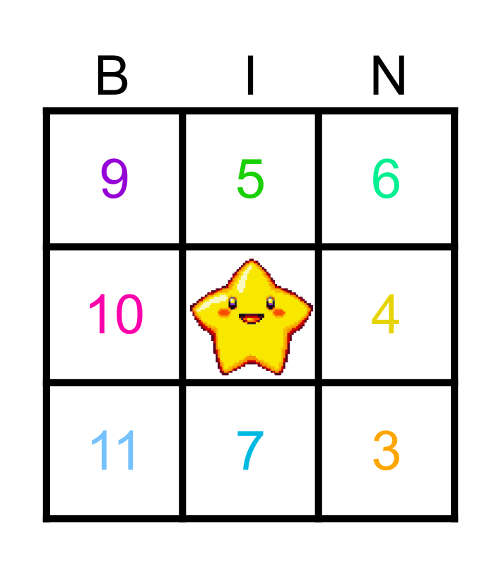 This bingo card has a free space and 12 words: 1, 2, 3, 4, 5, 6, 7, 8, 9, 10, 11 and 12.