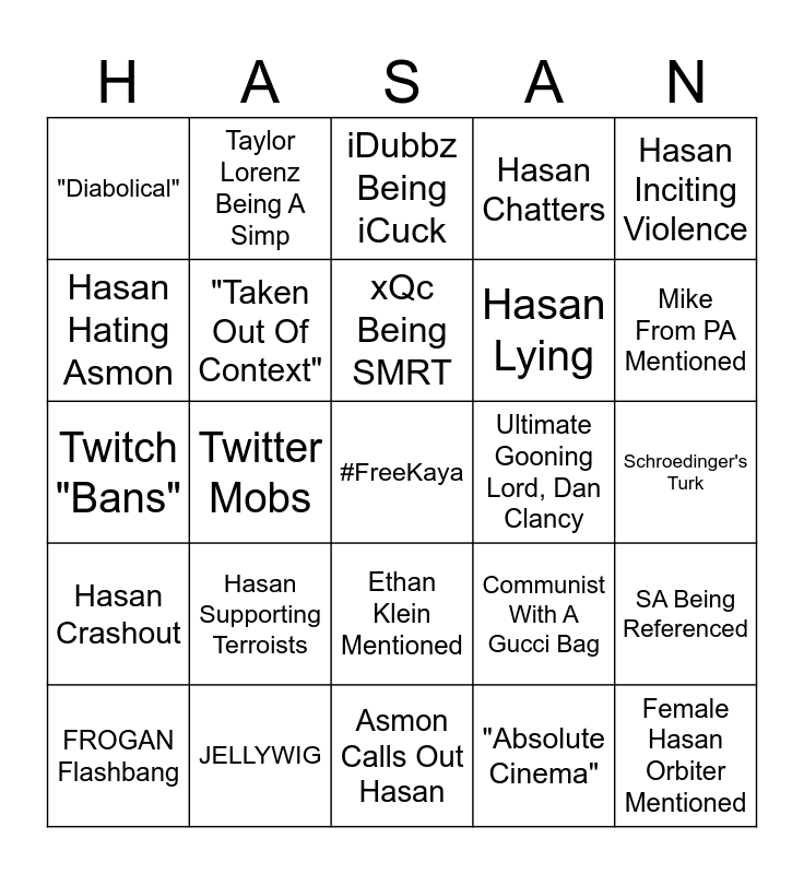 This bingo card has a free space and 24 words: Hasan Supporting Terroists, JELLYWIG, xQc Being SMRT, FROGAN Flashbang, Hasan Inciting Violence, "Diabolical", Hasan Hating Asmon, Taylor Lorenz Being A Simp, Ultimate Gooning Lord, Dan Clancy, Ethan Klein Mentioned, Hasan Lying, Twitch "Bans", Communist With A Gucci Bag, SA Being Referenced, "Taken Out Of Context", "Absolute Cinema", Schroedinger's Turk, iDubbz Being iCuck, Mike From PA Mentioned, Twitter Mobs, Female Hasan Orbiter Mentioned, Hasan Crashout, Hasan Chatters and Asmon Calls Out Hasan.
