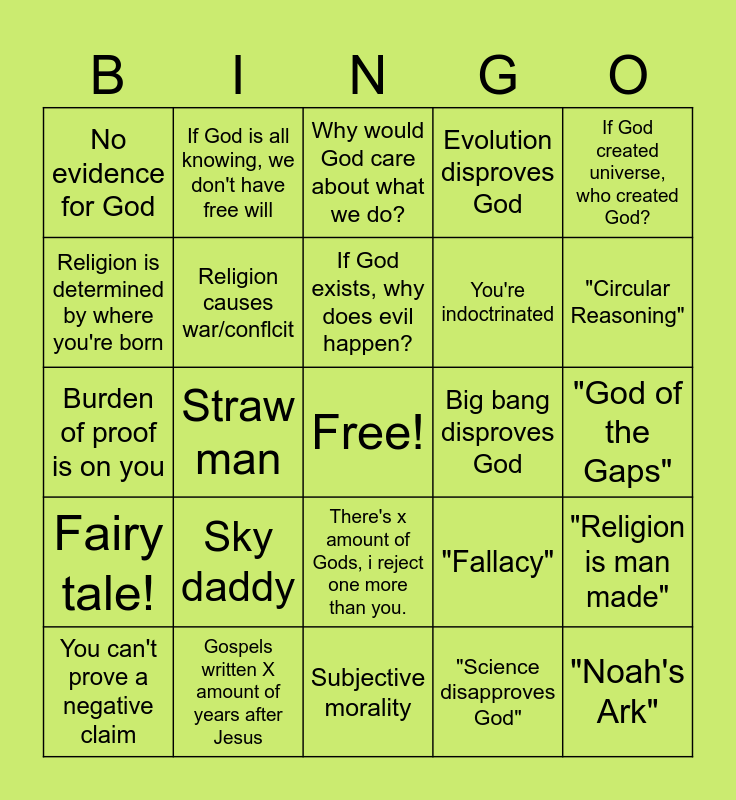 This bingo card has a free space and 24 words: Sky daddy, Gospels written X amount of years after Jesus, If God exists, why does evil happen?, You can't prove a negative claim, If God created universe, who created God?, No evidence for God, Religion is determined by where you're born, If God is all knowing, we don't have free will, Big bang disproves God, There's x amount of Gods, i reject one more than you., You're indoctrinated, Burden of proof is on you, "Fallacy", "Religion is man made", Religion causes war/conflcit, "Science disapproves God", "God of the Gaps", Why would God care about what we do?, "Circular Reasoning", Straw man, "Noah's Ark", Fairy tale!, Evolution disproves God and Subjective morality.