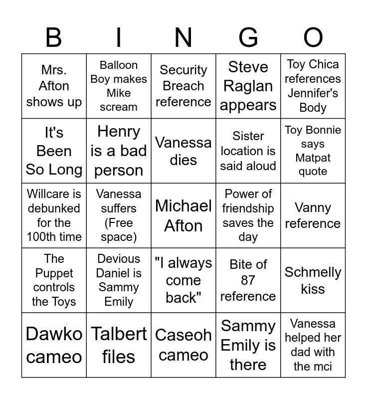 This bingo card has 42 words: Mike dies, Vanessa dies, Abby dies, Devious Daniel is Sammy Emily, Sammy Emily is there, Schmelly kiss, Michael Afton, Toy Chica twerks, Security Breach reference, "I always come back", Vanny reference, Toy Bonnie says Matpat quote, Vanessa suffers (Free space), Toy Chica references Jennifer's Body, CC or Elizabeth exist, Bite of 87 reference, Markiplier is here, Willcare is debunked for the 100th time, Mangle is a dog, Balloon Boy makes Mike scream, It's Been So Long, Silver Eyes reference, Vanessa helped her dad with the mci, Mrs. Afton shows up, Scream reference, Fredbears mention, Sister location is said aloud, Mike's parents come into play, Mike is Henry's son, Aunt Jane is mentioned, Autism is mentioned, The Puppet controls the Toys, Henry is a bad person, Caseoh cameo, Kory cameo, Dawko cameo, Talbert files, Power of friendship saves the day, Edwin reference, WHERE IS MY BALL, Steve Raglan appears and Springtrap.