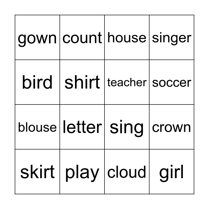 This bingo card has 16 words: play, crown, house, gown, blouse, count, sing, cloud, bird, shirt, skirt, singer, letter, soccer, teacher and girl.