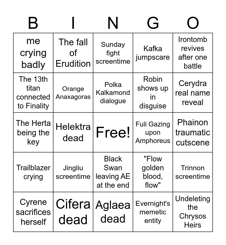 This bingo card has a free space and 24 words: Jingliu screentime, Cifera dead, Polka Kalkamond dialogue, Cyrene sacrifices herself, Irontomb revives after one battle, me crying badly, The 13th titan connected to Finality, The fall of Erudition, Fuli Gazing upon Amphoreus, Black Swan leaving AE at the end, Robin shows up in disguise, The Herta being the key, "Flow golden blood, flow", Trinnon screentime, Orange Anaxagoras, Evernight's memetic entity, Phainon traumatic cutscene, Sunday fight screentime, Cerydra real name reveal, Helektra dead, Undeleting the Chrysos Heirs, Trailblazer crying, Kafka jumpscare and Aglaea dead.