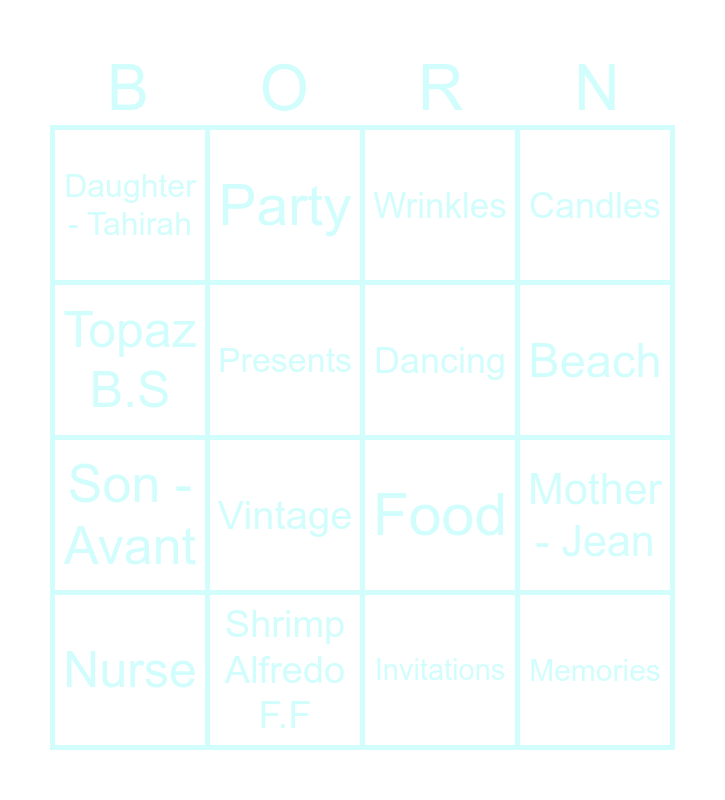 This bingo card has 50 words: Married, Nurse, November 8 th, Bingo Queen, Family, Friend's, Party, Birthday Cake, Presents, Games, Dancing, Candles, Flintstone ERA, Experienced, Action Suspense, Romantic Comedy, Beach, Shrimp Alfredo F.F, Orange F.C, Topaz B.S, Mother - Jean, Father - Beresford, Daughter - Tahirah, Son - Avant, Memory Loss, Naps, Vintage, Seasoned, Wrinkles, Over the Hill, Nifty at 50, Hard of Hearing, Carbon - Dated, Balloon's, Cards, Celebration, Ice Cream, Party Favors, Ribbons, Invitations, Happy Birthday, Fun, Chocolate, Shindig, Birthday Girl, Food, Laughter, Birthday Dress, Memories and Hangover's.