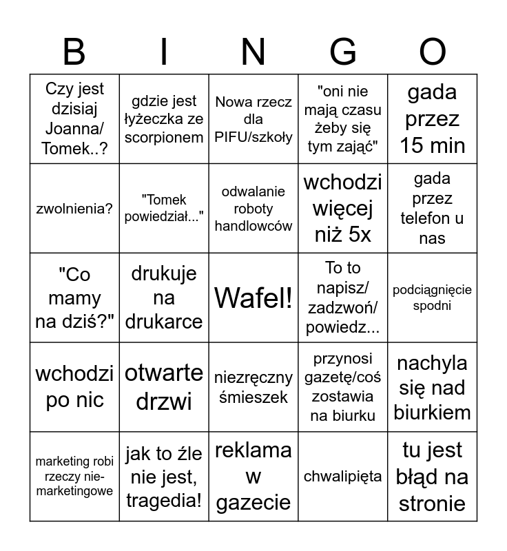 This bingo card has a free space and 24 words: otwarte drzwi, jak to źle nie jest, tragedia!, odwalanie roboty handlowców, marketing robi rzeczy nie-marketingowe, gada przez 15 min, Czy jest dzisiaj Joanna/ Tomek..?, zwolnienia?, gdzie jest łyżeczka ze scorpionem, To to napisz/ zadzwoń/ powiedz..., niezręczny śmieszek, wchodzi więcej niż 5x, "Co mamy na dziś?", przynosi gazetę/coś zostawia na biurku, nachyla się nad biurkiem, "Tomek powiedział...", chwalipięta, podciągnięcie spodni, Nowa rzecz dla PIFU/szkoły, gada przez telefon u nas, drukuje na drukarce, tu jest błąd na stronie, wchodzi po nic, "oni nie mają czasu żeby się tym zająć" and reklama w gazecie.