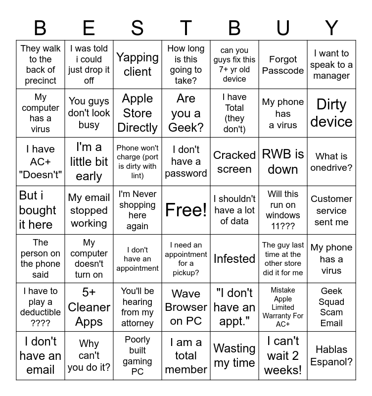 This bingo card has a free space and 48 words: "I don't have an appt.", My phone has a virus, I am a total member, My email stopped working, Phone won't charge (port is dirty with lint), Customer service sent me, I was told i could just drop it off, Why can't you do it?, Forgot Passcode, I need an appointment for a pickup?, I want to speak to a manager, How long is this going to take?, RWB is down, Cracked screen, I have to play a deductible ????, Will this run on windows 11???, My computer has a virus, Dirty device, Mistake Apple Limited Warranty For AC+, can you guys fix this 7+ yr old device, I have Total (they don't), I'm Never shopping here again, They walk to the back of precinct, You guys don't look busy, Geek Squad Scam Email, Apple Store Directly, What is onedrive?, I don't have an email, I don't have a password, I'm a little bit early, I can't wait 2 weeks!, I shouldn't have a lot of data, My phone has a virus, 5+ Cleaner Apps, But i bought it here, Infested, The guy last time at the other store did it for me, I have AC+ "Doesn't", I don't have an appointment, You'll be hearing from my attorney, The person on the phone said, Hablas Espanol?, Yapping client, Poorly built gaming PC, Are you a Geek?, Wave Browser on PC, My computer doesn't turn on and Wasting my time.