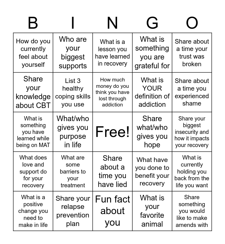 This bingo card has a free space and 24 words: What are some barriers to your treatment, Share your relapse prevention plan, How much money do you think you have lost through addiction, What is a positive change you need to make in life, Share about a time your trust was broken, How do you currently feel about yourself, Share your knowledge about CBT, Who are your biggest supports, Share what/who gives you hope, Share about a time you have lied, What is YOUR definition of addiction, What is something you have learned while being on MAT, What have you done to benefit your recovery, What is currently holding you back from the life you want, List 3 healthy coping skills you use, What is your favorite animal, Share your biggest insecurity and how it impacts your recovery, What is a lesson you have learned in recovery, Share about a time you experienced shame, What/who gives you purpose in life, Share something you would like to make amends with, What does love and support do for your recovery, What is something you are grateful for and Fun fact about you.