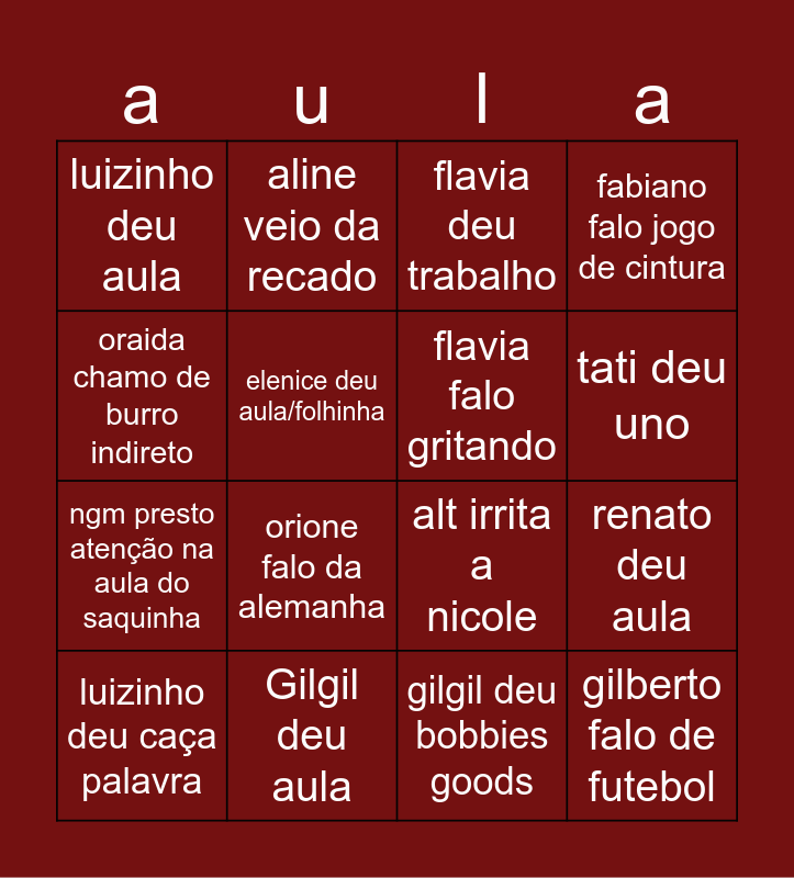This bingo card has 16 words: Gilgil deu aula, renato deu aula, flavia deu trabalho, luizinho deu aula, ngm presto atenção na aula do saquinha, aline veio da recado, alt irrita a nicole, gilgil deu bobbies goods, oraida chamo de burro indireto, elenice deu aula/folhinha, luizinho deu caça palavra, fabiano falo jogo de cintura, orione falo da alemanha, tati deu uno, flavia falo gritando and gilberto falo de futebol.