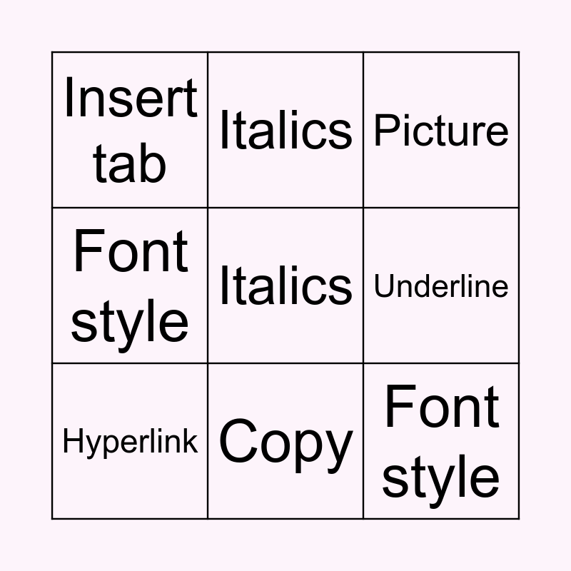 This bingo card has 36 words: Free!, Bold, Picture, Hyperlink, Table, Left align, Copy, Save as, Italics, Spell check, Font size, Font style, Underline, Bullet points, Shortcut key, Insert tab, Right align, Shapes, Bold, Picture, Hyperlink, Table, Left align, Copy, Save as, Italics, Spell check, Font size, Font style, Underline, Bullet points, Shortcut key, Insert tab, Right align, Shapes and Border.