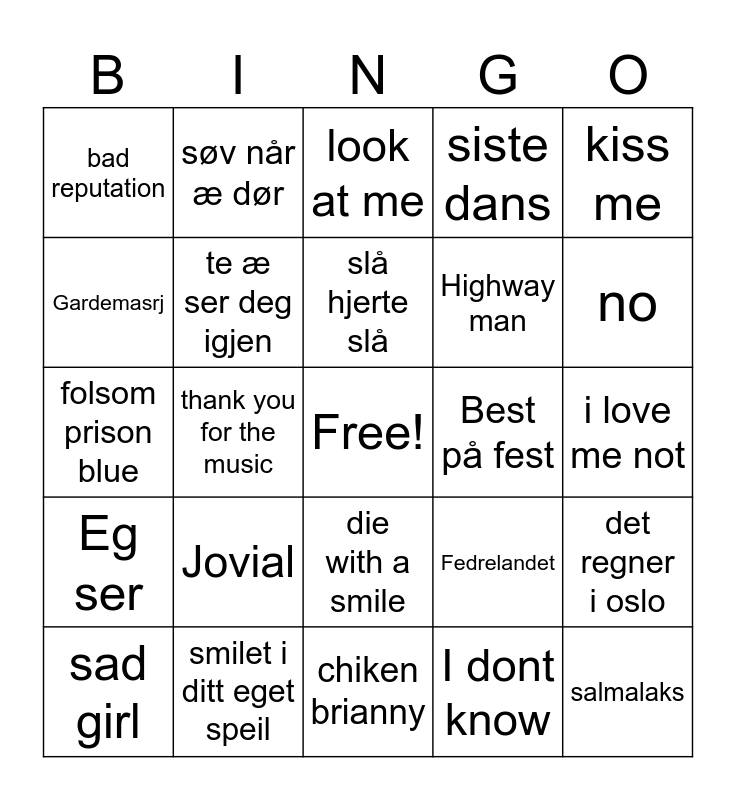 This bingo card has a free space and 24 words: Jovial, smilet i ditt eget speil, slå hjerte slå, sad girl, kiss me, bad reputation, Gardemasrj, søv når æ dør, Best på fest, die with a smile, Highway man, folsom prison blue, Fedrelandet, det regner i oslo, te æ ser deg igjen, I dont know, i love me not, look at me, no, thank you for the music, salmalaks, Eg ser, siste dans and chiken brianny.