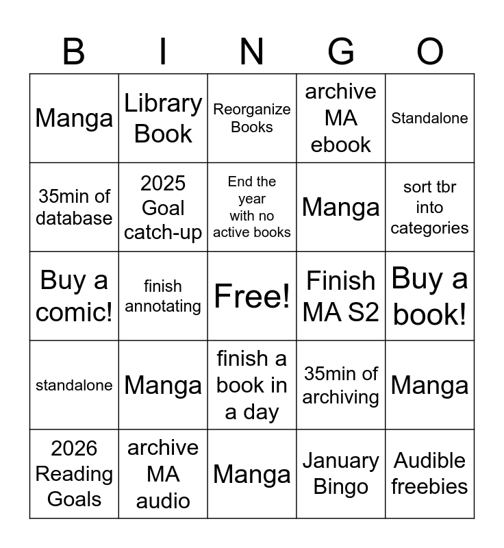 This bingo card has a free space and 24 words: 2026 Reading Goals, Manga, End the year with no active books, January Bingo, Standalone, Manga, Library Book, Reorganize Books, Finish MA S2, Buy a book!, Buy a comic!, 2025 Goal catch-up, 35min of archiving, Manga, 35min of database, archive MA audio, Manga, archive MA ebook, sort tbr into categories, standalone, finish annotating, finish a book in a day, Manga and Audible freebies.