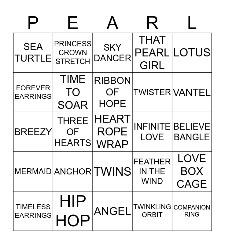 This bingo card has a free space and 24 words: ANCHOR, HIP HOP, RIBBON OF HOPE, TIMELESS EARRINGS, LOTUS, SEA TURTLE, FOREVER EARRINGS, PRINCESS CROWN STRETCH, INFINITE LOVE, TWINS, TWISTER, BREEZY, FEATHER IN THE WIND, LOVE BOX CAGE, TIME TO SOAR, TWINKLING ORBIT, BELIEVE BANGLE, SKY DANCER, VANTEL, THREE OF HEARTS, COMPANION RING, MERMAID, THAT PEARL GIRL and ANGEL.