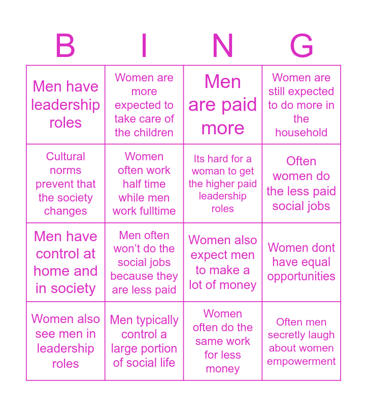 This bingo card has 16 words: Men typically control a large portion of social life, Women dont have equal opportunities, Men are paid more, Men have leadership roles, Men have control at home and in society, Women are more expected to take care of the children, Women also expect men to make a lot of money, Women often do the same work for less money, Cultural norms prevent that the society changes, Women often work half time while men work fulltime, Women also see men in leadership roles, Women are still expected to do more in the household, Men often won’t do the social jobs because they are less paid, Often women do the less paid social jobs, Its hard for a woman to get the higher paid leadership roles and Often men secretly laugh about women empowerment.