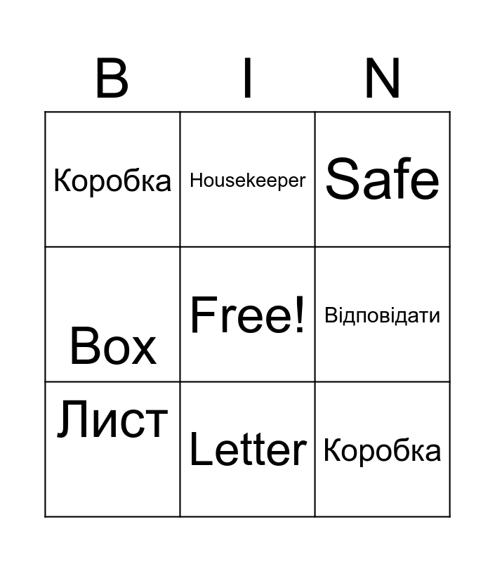 This bingo card has a free space and 15 words: Answer, Winter coat, Safe, Коробка, Letter, Коробка, Big head, Evening, Відповідати, Повільно, Blue, Box, Лист, Housekeeper and Зимове пальто.