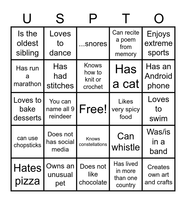 This bingo card has a free space and 24 words: Does not has social media, Owns an unusual pet, Knows how to knit or crochet, Hates pizza, Enjoys extreme sports, Is the oldest sibling, Has run a marathon, Loves to dance, Likes very spicy food, Knows constellations, Has a cat, Loves to bake desserts, Can whistle, Was/is in a band, Has had stitches, Has lived in more than one country, Loves to swim, ...snores, Has an Android phone, You can name all 9 reindeer, Creates own art and crafts, can use chopsticks, Can recite a poem from memory and Does not like chocolate.