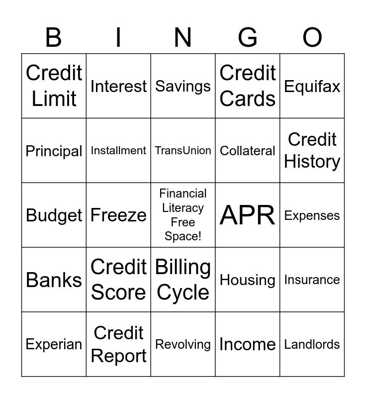 This bingo card has a free space and 24 words: Credit Score, Credit Report, TransUnion, Experian, Equifax, Credit Limit, Principal, Interest, APR, Billing Cycle, Collateral, Budget, Housing, Insurance, Installment, Income, Expenses, Savings, Credit History, Freeze, Landlords, Banks, Credit Cards and Revolving.