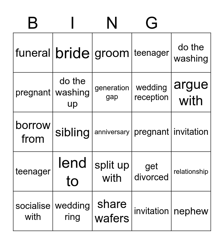 This bingo card has 33 words: nephew, niece, sibling, stepmother, teenager, do the washing up, do the washing, socialise with, bride, date, generation gap, groom, bring up, honeymoon, pregnant, argue with, wedding ring, borrow from, lend to, get divorced, split up with, Easter, funeral, invitation, share wafers, anniversary, teenager, wedding reception, pregnant, relationship, fireworks dispaly, invitation and guest.