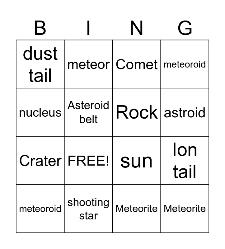 This bingo card has 20 words: Ion tail, atmosphere, Comet, coma, meteoroid, nucleus, shooting star, dust tail, Crater, meteor, FREE!, sun, Asteroid belt, Meteorite, Rock, Asteroid, astroid, meteoroid, Meteorite and astroid belt.