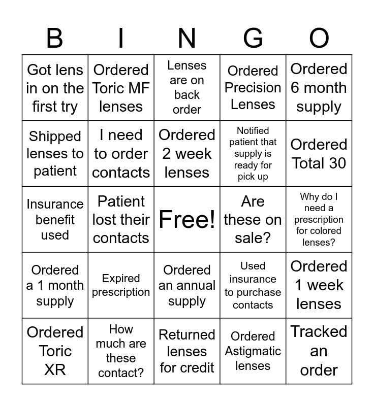 This bingo card has a free space and 29 words: Ordered Toric XR, Performed I&R, Patient lost their contacts, Patient is out of contacts, Got lens in on the first try, Lenses are on back order, I need to order contacts, Expired prescription, Are these on sale?, How much are these contact?, Why do I need a prescription for colored lenses?, Tracked an order, Returned lenses for credit, Ordered Astigmatic lenses, Ordered Total 30, Ordered AcuVue Max, Ordered an annual supply, Ordered a 1 month supply, Ordered 6 month supply, Insurance benefit used, Used insurance to purchase contacts, Notified patient that trials came in, Notified patient that supply is ready for pick up, Shipped lenses to patient, Ordered Precision Lenses, Ordered Toric MF lenses, Ordered 1 week lenses, Ordered 2 week lenses and Notified patient that order has been delayed.