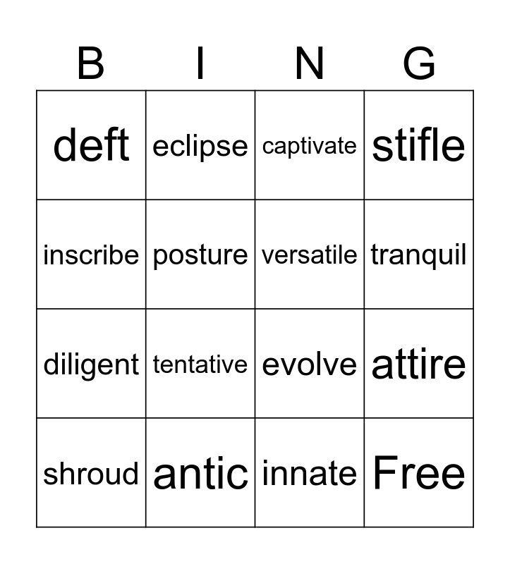 This bingo card has 16 words: antic, attire, captivate, deft, diligent, eclipse, evolve, innate, inscribe, posture, shroud, stifle, tentative, tranquil, versatile and Free.