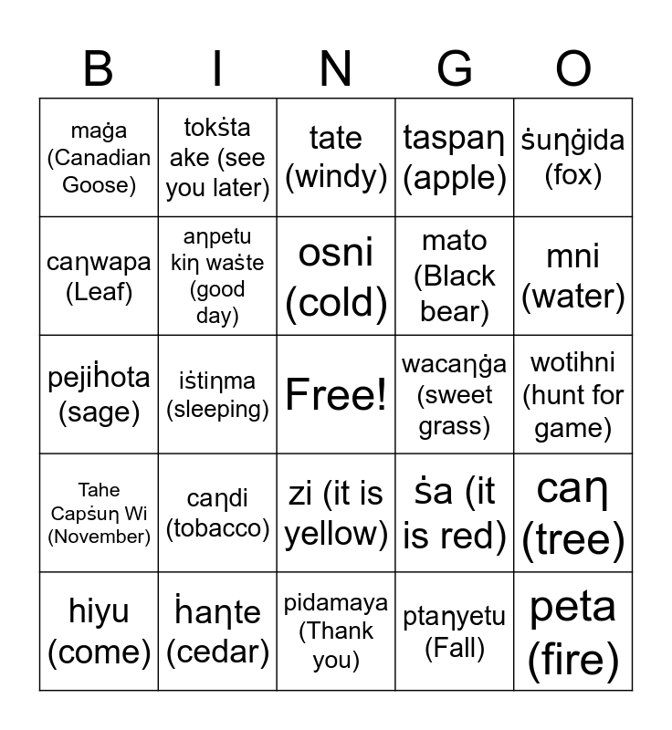 This bingo card has a free space and 34 words: haƞ/hau (yes), ptaƞyetu (Fall), wamnu (Pumpkin), hiya (no), Tahe Capṡuƞ Wi (November), aƞpetu kiƞ waṡte (good day), ṡuƞġida (fox), hiyu (come), tokṡta ake (see you later), wa hiƞhe (snowing), osni (cold), tate (windy), anukasaƞ (Bald Eagle), zica (Squirrel), wacaƞġa (sweet grass), mni (water), ḣaƞte (cedar), pejiḣota (sage), caƞdi (tobacco), ṡa (it is red), zi (it is yellow), zicataƞka (Turkey), maġa (Canadian Goose), wotihni (hunt for game), pidamaya (Thank you), peta (fire), taspaƞ (apple), psiƞ (wild rice), mato (Black bear), caƞwapa (Leaf), ihmu (Cat), iṡtiƞma (sleeping), caƞ (tree) and wamnaheza (Corn).