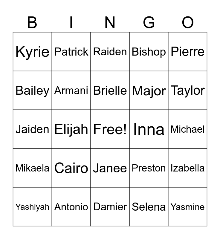 This bingo card has a free space and 51 words: Autumn, Yasmine, Jonte, Damier, Cairo, Prince-william, Patrick, Alani, Bailey, Eli, Armani, Bishop, Izabella, Preston, Delante, Jackson, Brielle, Inna, Riley, Pierre, Elijah, Selena, Kyrie, Major, Amara, Elijah, Taylor, Dyllan, Yashiyah, Raiden, Aloni, Connor, Journie, Theron, Sexture, Antonio, Braylon, Deliyah, Jazzelle, Carson, Michael, Mikaela, Kai'Andre, Jada, Gabryell, Ashton, Jaiden, Kevon, Airy'anna, Janee and Zachary.