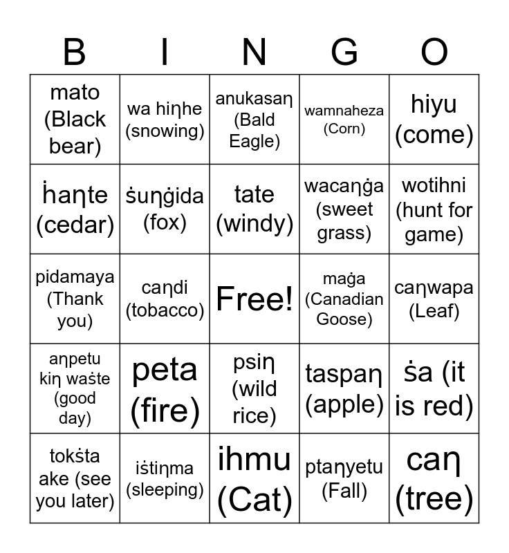 This bingo card has a free space and 34 words: haƞ/hau (yes), ptaƞyetu (Fall), hiya (no), Tahe Capṡuƞ Wi (November), aƞpetu kiƞ waṡte (good day), ṡuƞġida (fox), hiyu (come), tokṡta ake (see you later), wa hiƞhe (snowing), osni (cold), tate (windy), anukasaƞ (Bald Eagle), zica (Squirrel), zicataƞka (Turkey), maġa (Canadian Goose), wotihni (hunt for game), iṡtiƞma (sleeping), pidamaya (Thank you), peta (fire), taspaƞ (apple), psiƞ (wild rice), wamnu (Pumpkin), mato (Black bear), caƞwapa (Leaf), ihmu (Cat), caƞ (tree), wamnaheza (Corn), mni (water), wacaƞġa (sweet grass), ḣaƞte (cedar), pejiḣota (sage), caƞdi (tobacco), ṡa (it is red) and zi (it is yellow).