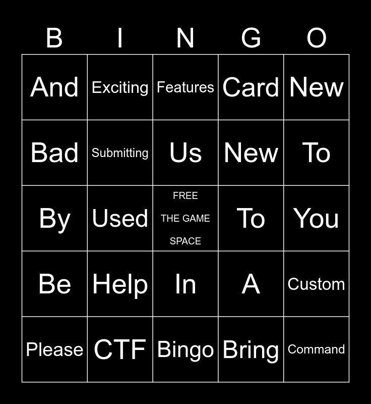 This bingo card has a free space and 24 words: Please, Help, Us, Bring, New, And, Exciting, Features, To, You, By, Submitting, A, Custom, Bad, CTF, Bingo, Card, To, Be, Used, In, New and Command.