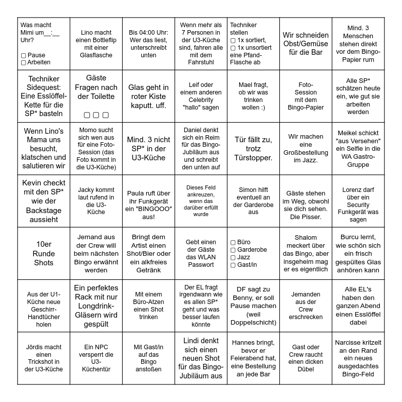 This bingo card has a free space and 48 words: DF sagt zu Benny, er soll Pause machen (weil Doppelschicht), Foto-Session mit dem Bingo-Papier, Lindi denkt sich einen neuen Shot für das Bingo-Jubiläum aus, Jacky kommt laut rufend in die U3-Küche, Mind. 3 nicht SP* in der U3-Küche, Lorenz darf über ein Security Funkgerät was sagen, Lino macht einen Bottleflip mit einer Glasflasche, Ein NPC versperrt die U3-Küchentür, Wir schneiden Obst/Gemüse für die Bar, Gebt einen der Gäste das WLAN Passwort, Mind. 3 Menschen stehen direkt vor dem Bingo-Papier rum, Wenn mehr als 7 Personen in der U3-Küche sind, fahren alle mit dem Fahrstuhl, Wir machen eine Großbestellung im Jazz., Tür fällt zu, trotz Türstopper., Aus der U1-Küche neue Geschirr-Handtücher holen, Gäste stehen im Weg, obwohl sie dich sehen. Die Pisser., Techniker Sidequest: Eine Esslöffel-Kette für die SP* basteln, Alle SP* schätzen heute ein, wie gut sie arbeiten werden, Jemanden aus der Crew erschrecken, Techniker stellen ▢ 1x sortiert, ▢ 1x unsortiert eine Pfand-Flasche ab, Mael fragt, ob wir was trinken wollen :), Paula ruft über ihr Funkgerät ein "BINGOOO" aus!, Was macht Mimi um__:__ Uhr? ▢ Pause ▢ Arbeiten, Gäste Fragen nach der Toilette ▢ ▢ ▢, Alle EL's haben den ganzen Abend einen Esslöffel dabei, Glas geht in roter Kiste kaputt. uff., Meikel schickt "aus Versehen" ein Selfie in die WA Gastro-Gruppe, Jördis macht einen Trickshot in der U3-Küche, Daniel denkt sich ein Reim für das Bingo-Jubiläum aus und schreibt den unten auf, Momo sucht sich wen aus für eine Foto-Session (das Foto kommt in die U3-Küche), Gast oder Crew raucht einen dicken Dübel, Simon hilft eventuell an der Garderobe aus, Burcu lernt, wie schön sich ein frisch gespültes Glas anhören kann, Ein perfektes Rack mit nur Longdrink- Gläsern wird gespült, Kevin checkt mit den SP* wie der Backstage aussieht, ▢ Büro ▢ Garderobe ▢ Jazz ▢ Gast/in, Shalom meckert über das Bingo, aber insgeheim mag er es eigentlich, Wenn Lino's Mama uns besucht, klatschen und salutieren wir, Bringt dem Artist einen Shot/Bier oder ein alkfreies Getränk, Mit einem Büro-Atzen einen Shot trinken, 10er Runde Shots, Narcisse kritzelt an den Rand ein neues ausgedachtes Bingo-Feld, Bis 04:00 Uhr: Wer das liest, unterschreibt unten, Mit Gast/in auf das Bingo anstoßen, Leif oder einem anderen Celebrity "hallo" sagen, Der EL fragt irgendwann wie es allen SP* geht und was besser laufen könnte, Jemand aus der Crew will beim nächsten Bingo erwähnt werden and Hannes bringt, bevor er Feierabend hat, eine Bestellung an jede Bar.
