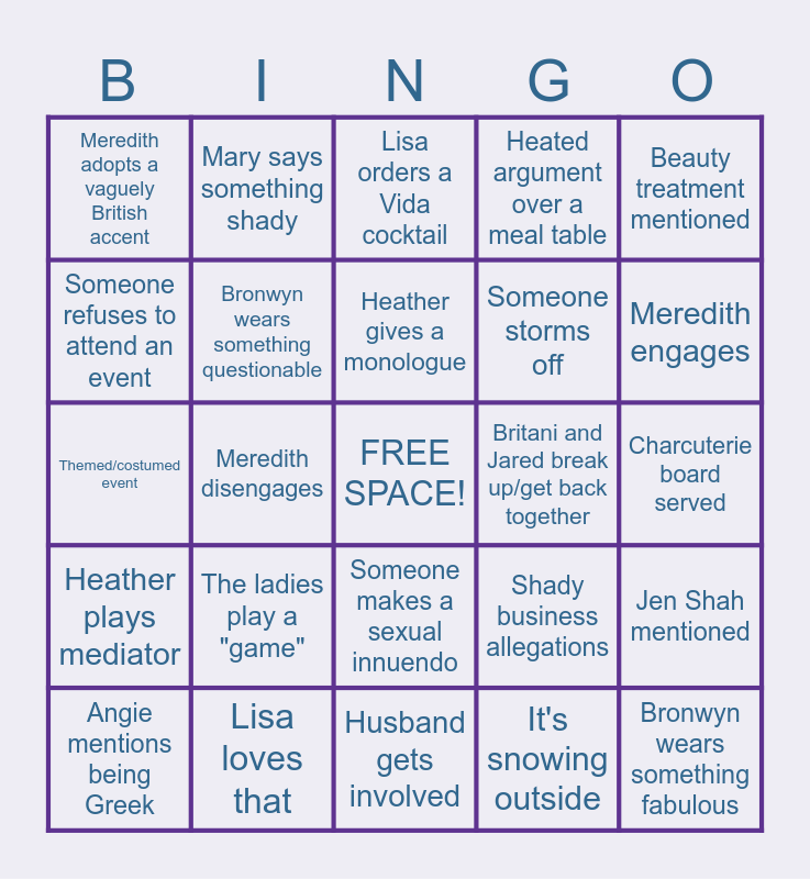This bingo card has a free space and 24 words: The ladies play a "game", Lisa loves that, Heather gives a monologue, Angie mentions being Greek, Beauty treatment mentioned, Meredith adopts a vaguely British accent, Someone refuses to attend an event, Mary says something shady, Britani and Jared break up/get back together, Someone makes a sexual innuendo, Someone storms off, Themed/costumed event, Shady business allegations, Jen Shah mentioned, Bronwyn wears something questionable, It's snowing outside, Charcuterie board served, Lisa orders a Vida cocktail, Meredith engages, Meredith disengages, Bronwyn wears something fabulous, Heather plays mediator, Heated argument over a meal table and Husband gets involved.