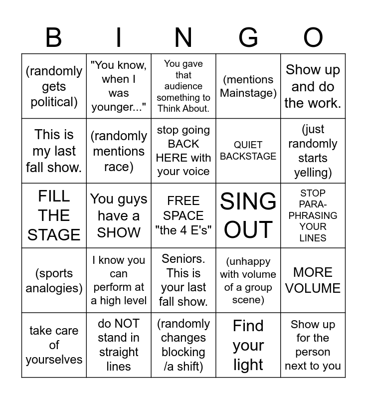 This bingo card has a free space and 24 words: I know you can perform at a high level, do NOT stand in straight lines, stop going BACK HERE with your voice, take care of yourselves, Show up and do the work., (randomly gets political), This is my last fall show., "You know, when I was younger...", SING OUT, Seniors. This is your last fall show., QUIET BACKSTAGE, FILL THE STAGE, (unhappy with volume of a group scene), MORE VOLUME, (randomly mentions race), Find your light, STOP PARA-PHRASING YOUR LINES, You gave that audience something to Think About., (just randomly starts yelling), You guys have a SHOW, Show up for the person next to you, (sports analogies), (mentions Mainstage) and (randomly changes blocking /a shift).