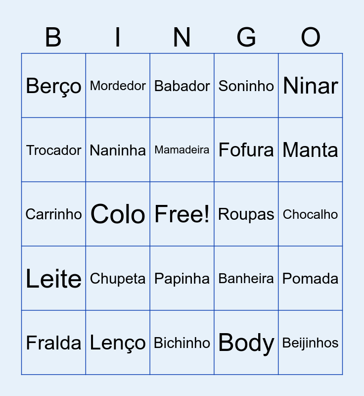 This bingo card has a free space and 24 words: Fralda, Chupeta, Mamadeira, Body, Ninar, Berço, Mordedor, Babador, Roupas, Chocalho, Carrinho, Naninha, Banheira, Pomada, Trocador, Lenço, Bichinho, Soninho, Manta, Leite, Colo, Papinha, Fofura and Beijinhos.