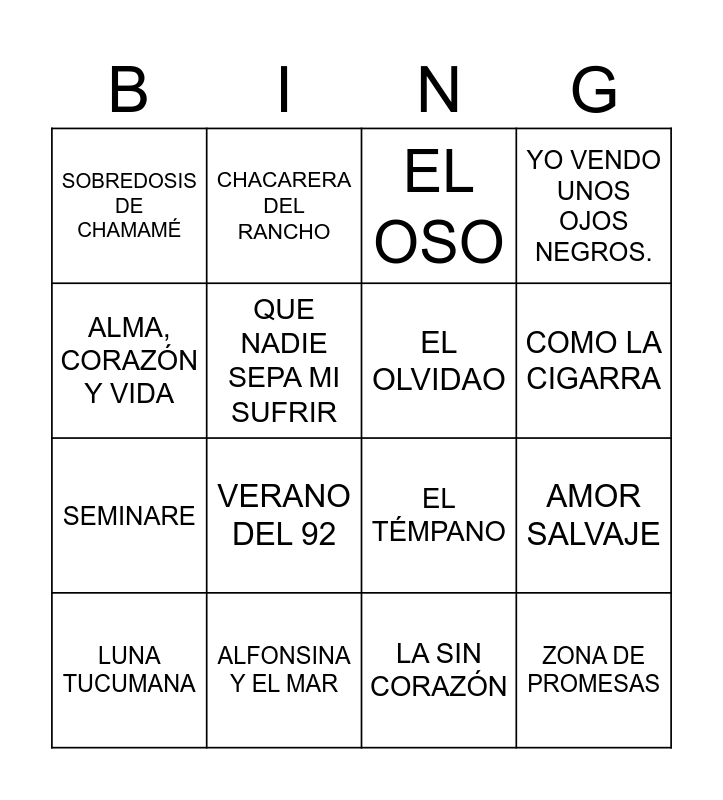 This bingo card has 50 words: Free!, LUNA TUCUMANA, LUNA CAUTIVA, ENTRÉ A MI PAGO SIN GOLPEAR, DESDE EL PUENTE CARRETERO, DÉJAME QUE ME VAYA, CHACARERA DEL RANCHO, ETERNO AMOR, QUE NADIE SEPA MI SUFRIR, VIENES Y TE VAS, EL OLVIDAO, YO VENDO UNOS OJOS NEGROS., CANDOMBE PARA JOSÉ, SOLO LE PIDO A DIOS, LA FLOR AZUL, SUBE SUBE SUBE, COMO LA CIGARRA, ALFONSINA Y EL MAR, MIRÁ QUE LINDO MI PAÍS PAISANO, ALMA, CORAZÓN Y VIDA, AMOR SALVAJE, ZAMBA DE MI ESPERANZA, SOBREDOSIS DE CHAMAMÉ, SEMINARE, EL AMOR DESPUÉS DEL AMOR, COSTUMBRES ARGENTINAS, VERANO DEL 92, LA BALSA, EL OSO, EL MOMENTO EN QUE ESTÁS, DESCONFÍO DE LA VIDA, EN EL PAÍS DE LA LIBERTAD, LOS DINOSAURIOS, MANUELITA LA TORTUGA, SAN LORENZO, OJOS DE CIELO, ZAMBA PARA OLVIDARTE, EL HUMAHUAQUEÑO, LA YAPA, LA SIN CORAZÓN, A DON ATA, PAISAJE DE CATAMARCA, KILÓMETRO 11, CHACARERATA DEL EXILIO, SI SE CALLA EL CANTOR,, EL TÉMPANO, TREN DEL CIELO, EN EL PAÍS DE LA LIBERTAD., ZONA DE PROMESAS and EL ÁNGEL DE LA BICICLETA.