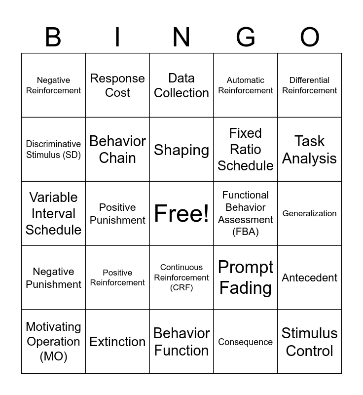 This bingo card has a free space and 24 words: Positive Reinforcement, Extinction, Shaping, Motivating Operation (MO), Differential Reinforcement, Negative Reinforcement, Discriminative Stimulus (SD), Response Cost, Functional Behavior Assessment (FBA), Continuous Reinforcement (CRF), Fixed Ratio Schedule, Variable Interval Schedule, Prompt Fading, Antecedent, Behavior Chain, Consequence, Generalization, Data Collection, Task Analysis, Positive Punishment, Stimulus Control, Negative Punishment, Automatic Reinforcement and Behavior Function.