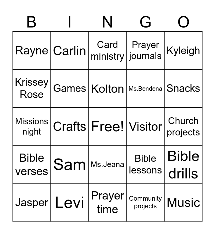 This bingo card has a free space and 24 words: Sam, Levi, Kolton, Jasper, Kyleigh, Rayne, Krissey Rose, Carlin, Visitor, Ms.Jeana, Ms.Bendena, Missions night, Bible lessons, Bible drills, Games, Community projects, Church projects, Card ministry, Snacks, Crafts, Music, Bible verses, Prayer journals and Prayer time.
