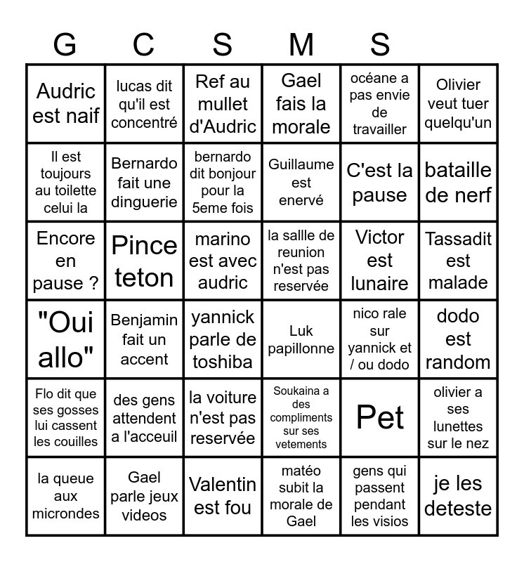 This bingo card has 36 words: "Oui allo", Benjamin fait un accent, Valentin est fou, Guillaume est enervé, Victor est lunaire, Tassadit est malade, Audric est naif, Gael parle jeux videos, Ref au mullet d'Audric, Soukaina a des compliments sur ses vetements, C'est la pause, Olivier veut tuer quelqu'un, Flo dit que ses gosses lui cassent les couilles, Pince teton, bernardo dit bonjour pour la 5eme fois, Gael fais la morale, Pet, dodo est random, Il est toujours au toilette celui la, Bernardo fait une dinguerie, yannick parle de toshiba, Luk papillonne, nico rale sur yannick et / ou dodo, olivier a ses lunettes sur le nez, Encore en pause ?, lucas dit qu'il est concentré, marino est avec audric, matéo subit la morale de Gael, océane a pas envie de travailler, bataille de nerf, la queue aux microndes, des gens attendent a l'acceuil, la voiture n'est pas reservée, la sallle de reunion n'est pas reservée, gens qui passent pendant les visios and je les deteste.