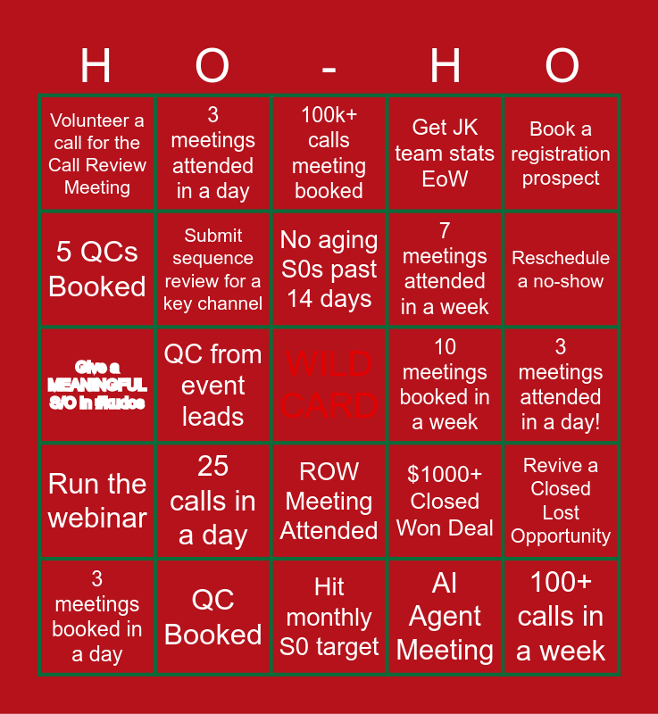This bingo card has a free space and 24 words: 25 calls in a day, QC Booked, No aging S0s past 14 days, 3 meetings booked in a day, Book a registration prospect, Volunteer a call for the Call Review Meeting, 5 QCs Booked, 3 meetings attended in a day, 10 meetings booked in a week, ROW Meeting Attended, 7 meetings attended in a week, Give a MEANINGFUL S/O in #kudos, $1000+ Closed Won Deal, Revive a Closed Lost Opportunity, Submit sequence review for a key channel, AI Agent Meeting, 3 meetings attended in a day!, 100k+ calls meeting booked, Reschedule a no-show, QC from event leads, 100+ calls in a week, Run the webinar, Get JK team stats EoW and Hit monthly S0 target.