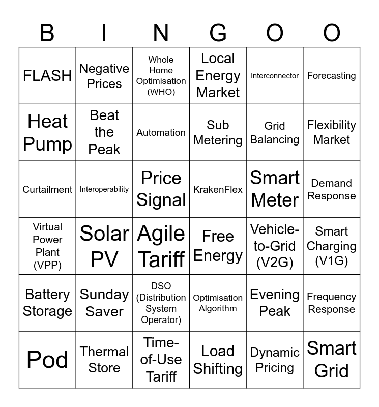 This bingo card has 36 words: Optimisation Algorithm, DSO (Distribution System Operator), Load Shifting, Heat Pump, Virtual Power Plant (VPP), KrakenFlex, Beat the Peak, Time-of-Use Tariff, Interconnector, Evening Peak, Flexibility Market, Local Energy Market, Frequency Response, Interoperability, Sub Metering, FLASH, Battery Storage, Smart Meter, Curtailment, Whole Home Optimisation (WHO), Price Signal, Solar PV, Free Energy, Agile Tariff, Vehicle-to-Grid (V2G), Negative Prices, Grid Balancing, Thermal Store, Automation, Forecasting, Smart Grid, Pod, Smart Charging (V1G), Demand Response, Sunday Saver and Dynamic Pricing.