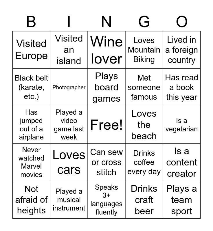 This bingo card has a free space and 43 words: Worked less than 1 year at Red Hat, Plays a team sport, Enjoys Hiking, Not afraid of heights, Collector (e.g. coins, flags, stamps, etc.), Drinks craft beer, Wine lover, Had a good meal in an unusual location, Lived in a foreign country, Played a musical instrument, Loves Mountain Biking, Loves the beach, Can sew or cross stitch, Loves cars, Likes to cook, Speaks 3+ languages fluently, Has young kids, Has jumped out of a airplane, Makes their own beer, Has read a book this year, Visited an island, Has 3+ siblings, Knows how to ski or snowboard, Visited Europe, Can make sushi rolls, Is a vegetarian, Owns a Nintendo Switch, Has a pet that is not a cat or dog, Drinks coffee every day, Never watched Marvel movies, Loves to dance, Is a content creator, Has studied abroad, Played a video game last week, Grows vegetables, Can run 5km, Can sing, dance, or act, Plays board games, Black belt (karate, etc.), Met someone famous, Lives near family/friends, Photographer and Has been on TV.