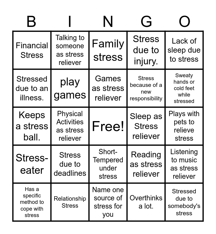 This bingo card has a free space and 24 words: Stress due to deadlines, Relationship Stress, Games as stress reliever, Has a specific method to cope with stress, Lack of sleep due to stress, Financial Stress, Stressed due to an illness., Talking to someone as stress reliever, Sleep as Stress reliever, Short-Tempered under stress, Stress because of a new responsibility, Keeps a stress ball., Reading as stress reliever, Listening to music as stress reliever, play games, Overthinks a lot., Plays with pets to relieve stress, Family stress, Sweaty hands or cold feet while stressed, Physical Activities as stress reliever, Stressed due to somebody's stress, Stress- eater, Stress due to injury. and Name one source of stress for you.
