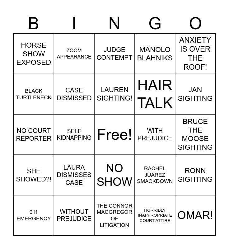 This bingo card has a free space and 29 words: 911 EMERGENCY, EMERGENCY MOTION TO DITCH OUT, SELF KIDNAPPING, FALLS OFF HORSE, HORSE SHOW EXPOSED, JUDGE CONTEMPT, CASE DISMISSED, LAURA DISMISSES CASE, WITH PREJUDICE, WITHOUT PREJUDICE, BRUCE THE MOOSE SIGHTING, OMAR!, THE CONNOR MACGREGOR OF LITIGATION, HORRIBLY INAPPROPRIATE COURT ATTIRE, JAN SIGHTING, DAVE NEAL!, NO SHOW, SHE SHOWED?!, ANXIETY IS OVER THE ROOF!, NO COURT REPORTER, RACHEL JUAREZ SMACKDOWN, 15 MNS OBLIG.BS, HAIR TALK, BLACK TURTLENECK, MANOLO BLAHNIKS, ZOOM APPEARANCE, RONN SIGHTING, LAUREN SIGHTING! and HOUSE OF PRIME RIB.
