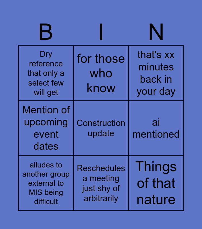 This bingo card has a free space and 8 words: ai mentioned, that's xx minutes back in your day, for those who know, alludes to another group external to MIS being difficult, Dry reference that only a select few will get, Things of that nature, Mention of upcoming event dates and Reschedules a meeting just shy of arbitrarily.