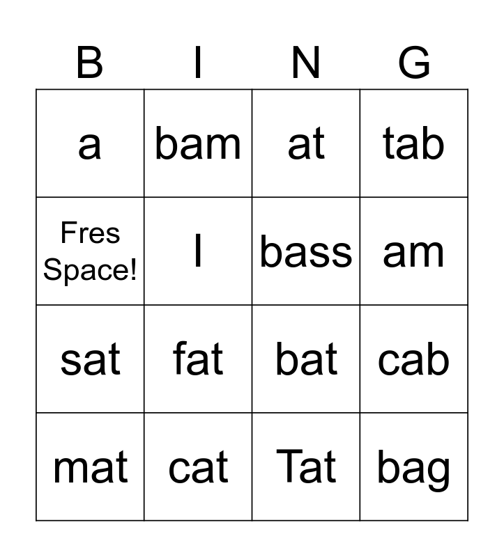 This bingo card has 16 words: cat, cab, at, a, sat, bam, bat, Tat, Fres Space!, I, mat, tab, fat, am, bass and bag.